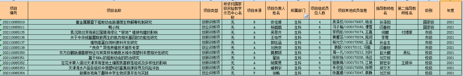 根据《关于开展2021年度大学生创新创业训练计划项目申报工作的通知》和《sunbet申搏大学生创新创业训练计划项目管理办法(试行)》等要求,经学院推荐,教务处审核,现场答辩,专家评审,我院2021年度申报并获批11项“大创项目”,其中创新项目获批校级5项,市级4项,国家级2项,受益学生48人次,累计获资助经费9万元,详情如下: